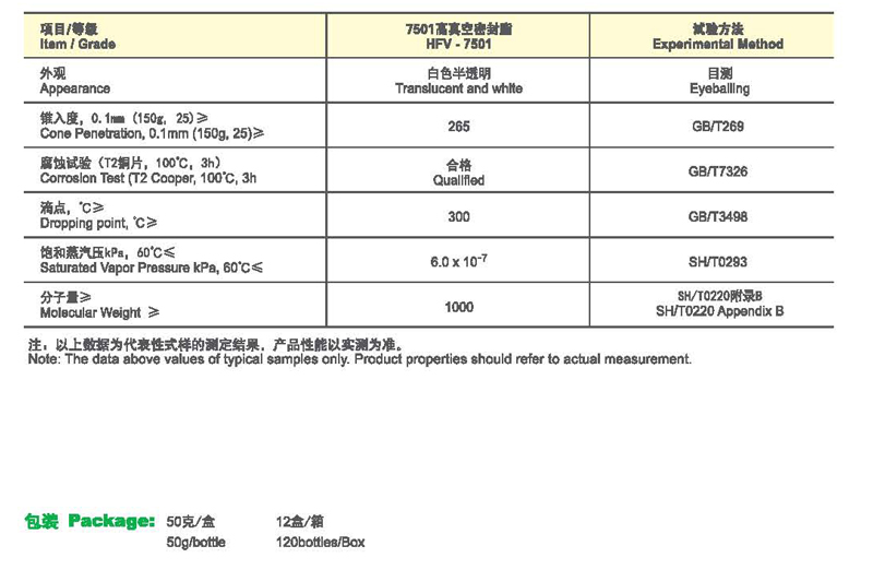 *较好的高低温性能。 *较好的氧化安定性和化学稳定性。 *耐水密封性能,抗溶剂性能及电性能较好。 *适宜的分子量分布,保证系统的真空度。